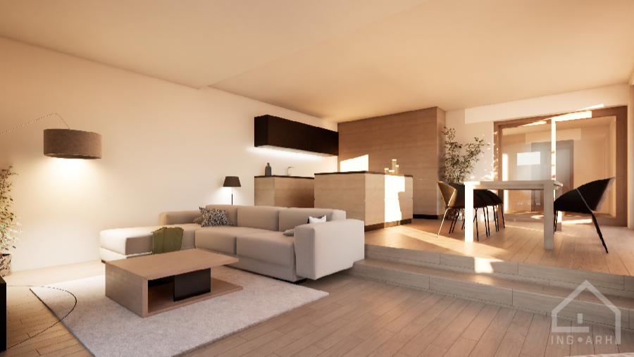 Stanovanjski vhod je na vzhodu, z bivalnimi prostori, spalnico s kopalnico, savno in zasebno teraso. V nadstropju sta dve otroški sobi in kopalnica.